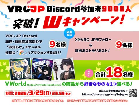 VRChatVRC-JP Discord参加者9000人突破で、感謝を込めてプレゼント企画を開催します! 🎁 抽選で合計18名様V WORLD(https://vworld.booth.pm/)の好きな商品を1つプレ...