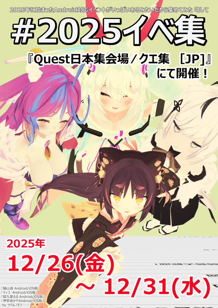 「2025年に開始したAndroid対応イベント」を募集したポスター展示会『#2025イベ集』が開催中。実機で参加確認済みの”行ける”企画がずらり。会場はクエ集こと『Quest日本集会場 ⁄ クエ集 [JP]』。2025/12/26(金)~12/31(水)開催。