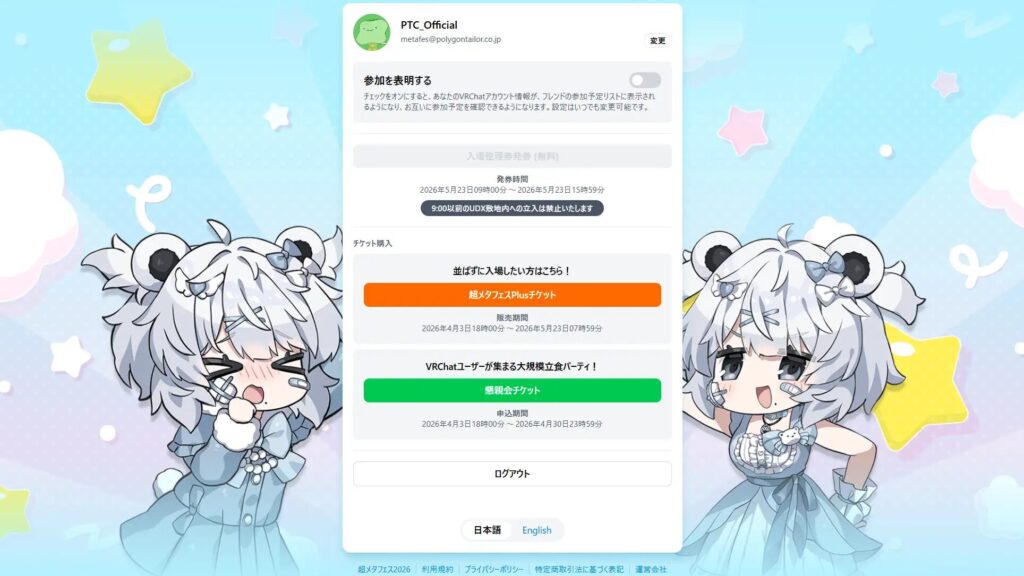 『超メタフェス2026』では、来場者の体験価値向上を目的に混雑緩和のためのVRChatアカウントでログインできるデジタル整理券を導入いたします。