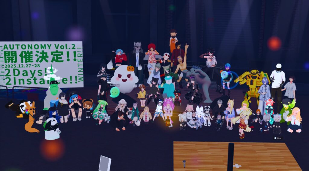 2025年8月に初めて開催した「Autonomy vol.1」。VRChatでラッパーとして活動して5年のryouryouさんが発起人として主催し、おなじくラッパーとして活動するゴンザレス下野さんが運営として制作を担当する音楽イベントです。vol.1は10組の出演者で5時間のイベントを開催し、フルインスタンスを達成するなど好評を博しました。