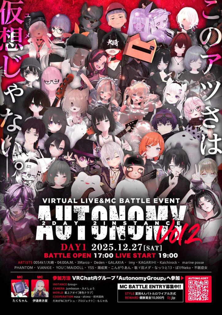 VRChatでラッパーとして活動するryouryouは、2025年12月27日(土)と28日(日)の2日間にわたって、各日2インスタンスで5時間超えの音楽フェス「Autonomy vol.2」を開催することを発表しました。