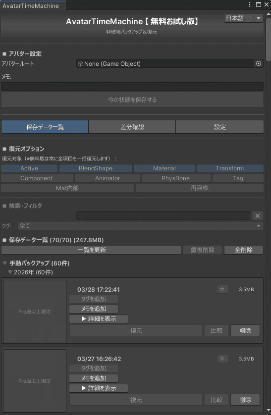 重いメッシュやテクスチャ自体はコピーせず、状態の数値と参照のみを数KBの超軽量なJSONデータとして記録。これにより、改変の途中で何十回バックアップを取っても、プロジェクトの容量を圧迫しません。また、有料版をご購入いただくとマテリアルのみ、など部分復元ができたり、保存データの差分確認などができるようになります。詳しくはBOOTHの販売ページをご覧ください。