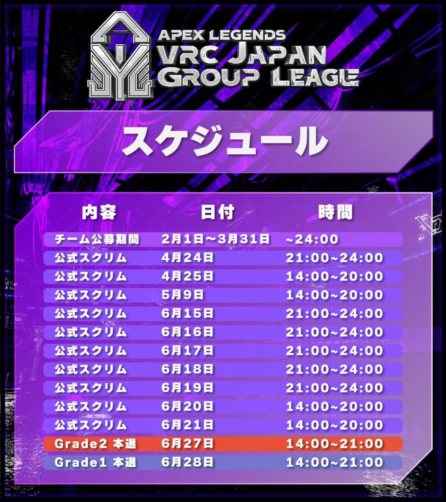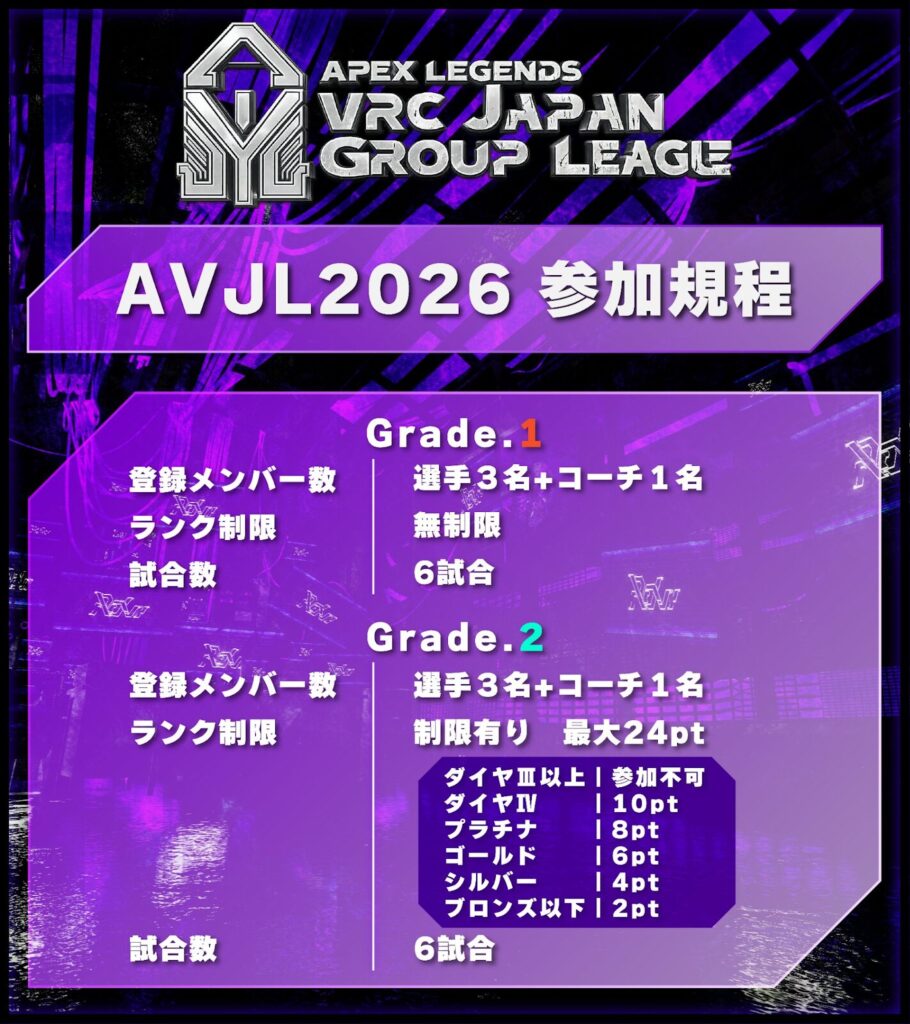 マッチで得られる得点など、細かい変更点は大会規定(ApexLegends VRChatJapanGroup League 2026 大会規定)を参照のこと。