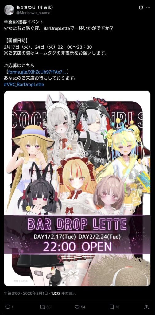 今回ご紹介するのは、その中でもカクテルモチーフ少女のRPイベント『BarDropLette』! 2026年2月17日(火)と24日(火)の22:00~23:30に開催されます。