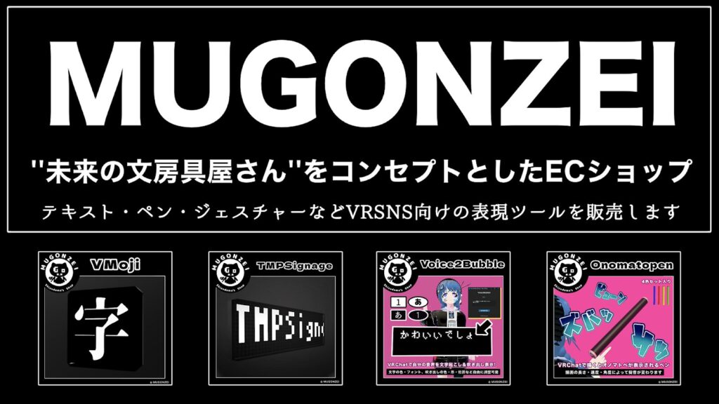 MUGONZEIはテキスト・ペン・ジェスチャーなどに焦点を当てた無言勢のためのBOOTHストアです。オーナーは物語を拡張する”メディアノベリスト”の沈黙静寂(しずだま しずさび)。“未来の文房具屋さん”をコンセプトにVRChatを始めとしたVRSNSで使用可能なコミュニケーションツールを販売します。