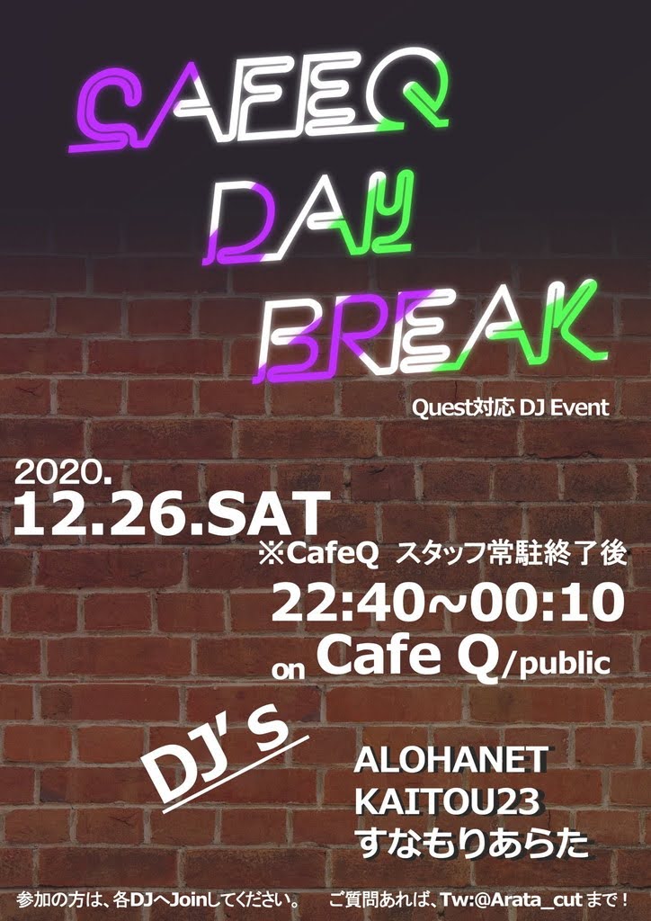 Cafe Qの営業後に行われていたQuest対応でのDJイベントです。現在”西脇電音工学™”の主宰である、すなもりあらた氏が店主Saguziに「Cafe QをジャックしてDJイベントがやりたい!」と言ったところ、開催が決定しました。