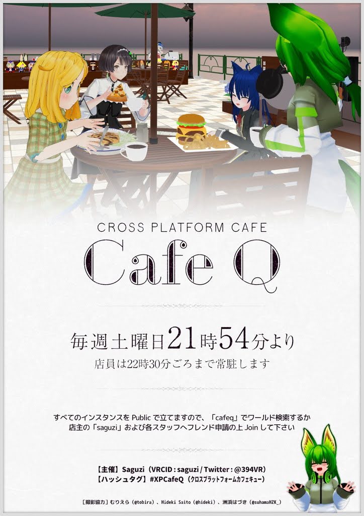 クロスプラットフォームカフェ”Cafe Q”は、2020年から約6年間、300回以上の開催を重ねて参りました。今ではVRChatにおいてプラットフォームからユーザー歴までを問わず多様な交流の場が生まれており、私たちは当初の役割を十分に果たしたと考えています。加えて主催者の個人的な事情もあり、この度、2026年2月28日(316日目)の営業を以てイベントを終了することを決定いたしました。足を運んでくださった皆様方の長年のご愛顧にスタッフ一同、感謝と御礼を申し上げます。
