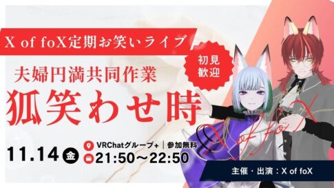VRChat夫婦漫才コンビ 「X of foX(クラブフォックス)」 が、11月14日に単独公演を開催! 各イベントで観客を沸かせてきた、今話題の夫婦漫才コンビ 「X of foX(クラブフォックス)」 が、11月14日ついに単独公...