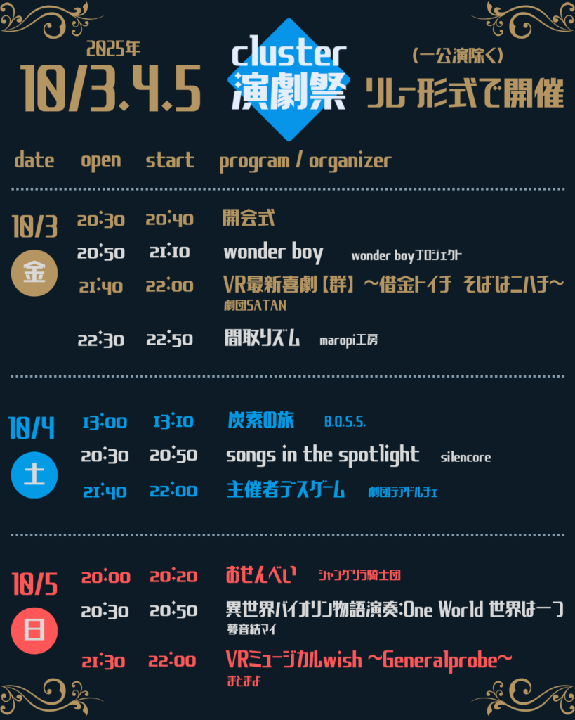 既にclusterで活動する団体、VRChatで活躍しているがclusterでは初公演の団体、公演初挑戦の団体、計9団体の参加が決定!演目内容も多岐にわたります!