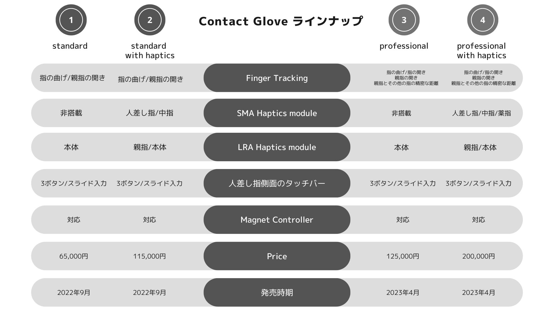 既存のVRコントローラと同等以上の機能を持たせながら、より自然な装着ができるグローブ型、コンシューマ向けを想定した低価格を実現しています。今後のVR体験におけるコントローラーのスタンダードとすることを目指し開発したとのことです。