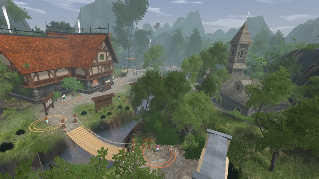 他にも各地にあるポータルから、高所に上ることができます。村を一望できるので、どこに人が集まっているかや、建物の場所がすぐにわかります。
