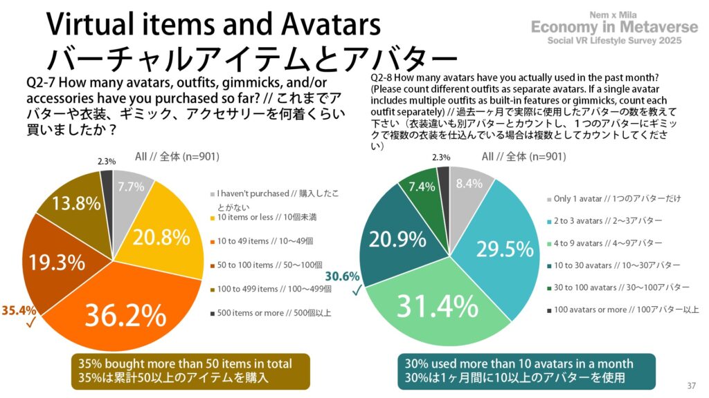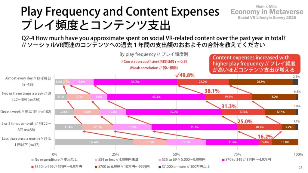・バーチャルアイテム:全体の35%が累計50以上のアイテムを購入していた。Resoniteユーザーでは19%とやや少なめだった。購入数はプレイ頻度・プレイ時間と相関関係があり、10,000時間以上プレイしているユーザーの40%以上が50以上のアイテムを購入していた。