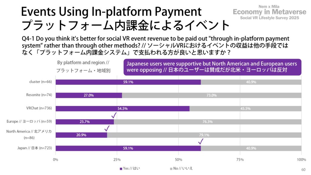 ・賛否両論:イベント収益が「プラットフォーム内課金システム」で支払われる方が良いかどうかは約半々で意見が真っ二つに割れた。日本のユーザーは賛成だが北米・ヨーロッパは反対であった。