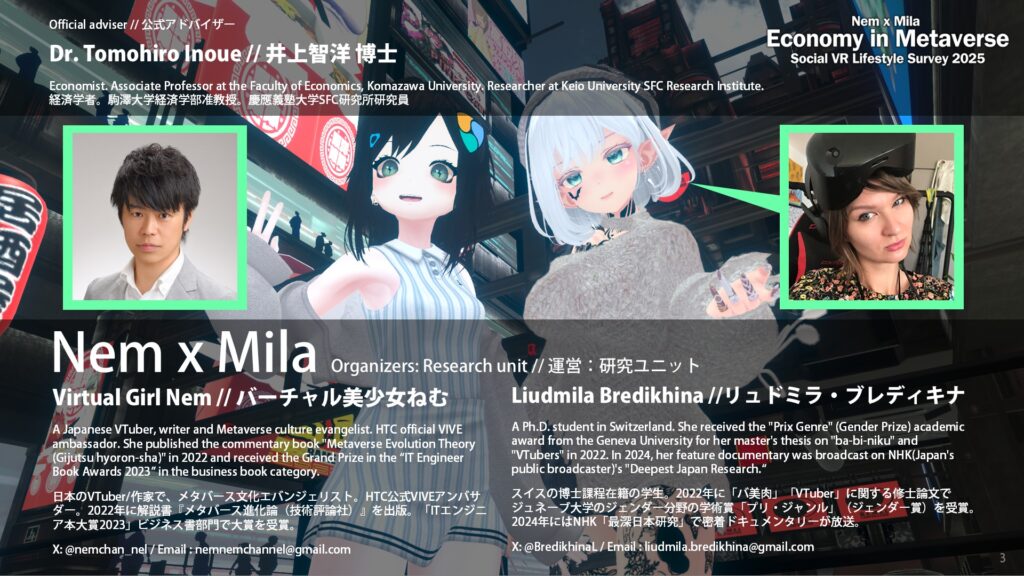 「メタバース経済」はスイスの人類学者ミラとVTuber/作家バーチャル美少女ねむがVTuberやメタバースが人類に与える影響を調査するために結成した研究ユニット「Nem x Mila(ねむみら)」による大規模調査プロジェクト「ソーシャルVRライフスタイル調査」シリーズの第6弾である。これまでの6回に渡る調査の総回答数は6,000件を超える。Nem x Milaは2023年には国際連合の国際会議「IGF京都2023」でも活動について登壇発表を行った。