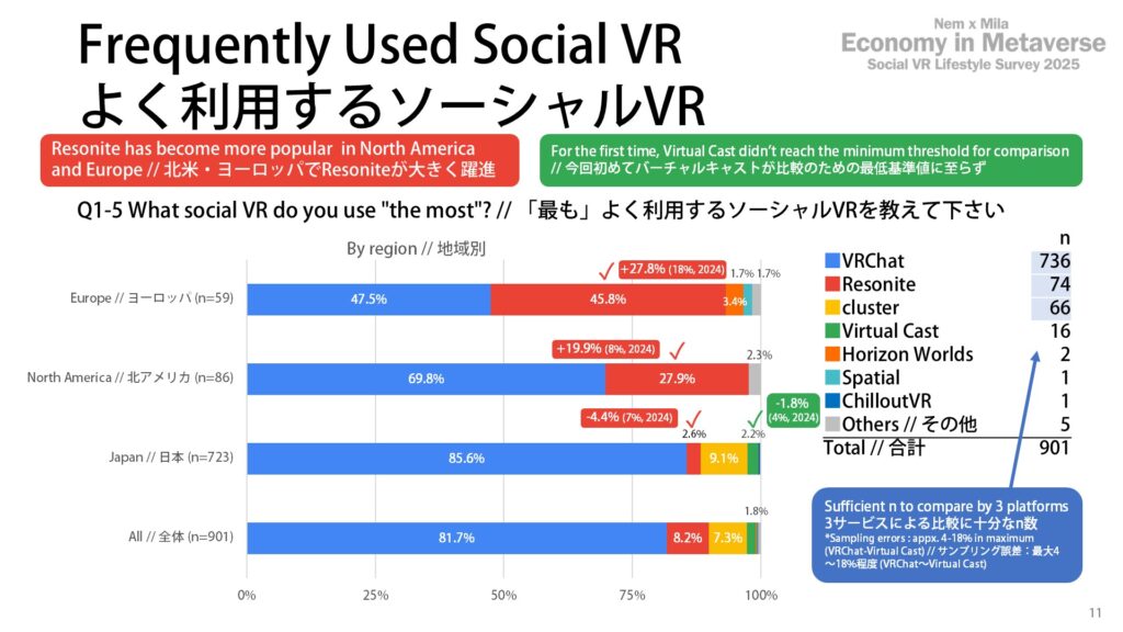 ・プラットフォーム:例年通り地域に関わらずVRChatが首位を維持しているが、北米・ヨーロッパでResoniteが大きく躍進した。一方でバーチャルキャストの回答数は減少した。