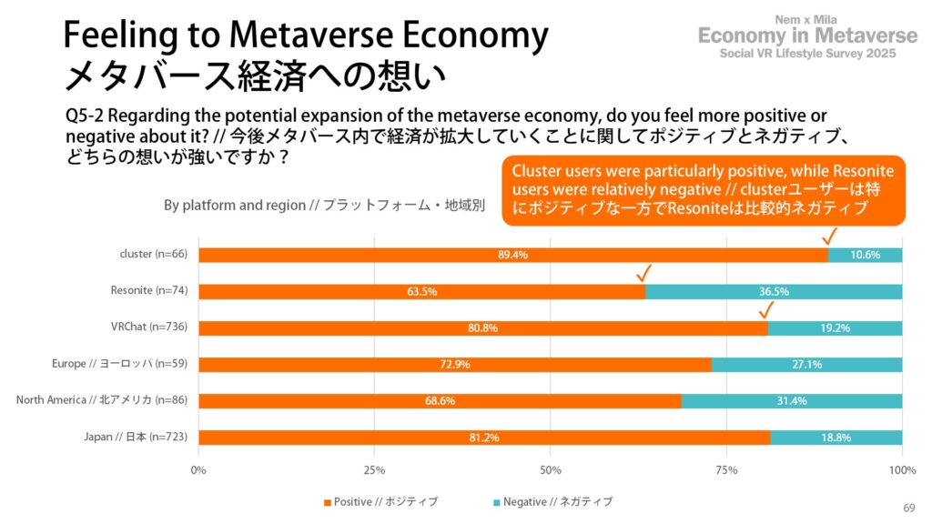 ・経済への想い:全体の80%がメタバース経済にポジティブであった。clusterユーザーは特にポジティブな一方でResoniteは比較的ネガティブであった。