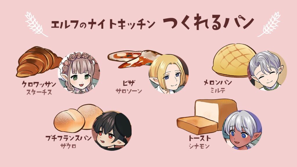 お店で作ることのできるパンは5種類です。それぞれ担当のエルフがついております。一回の営業で当選するお客様は3名となっておりますので、外れてしまった方はぜひ次回チャレンジしてみてくださいね。