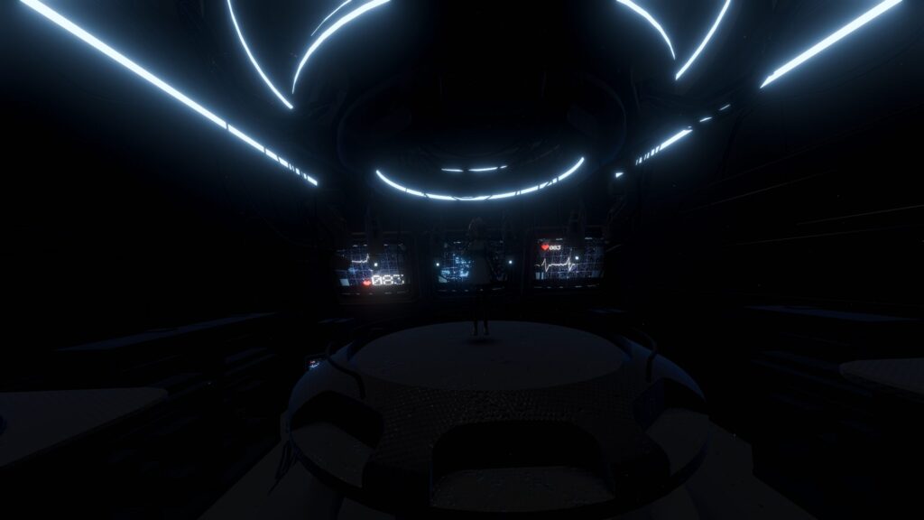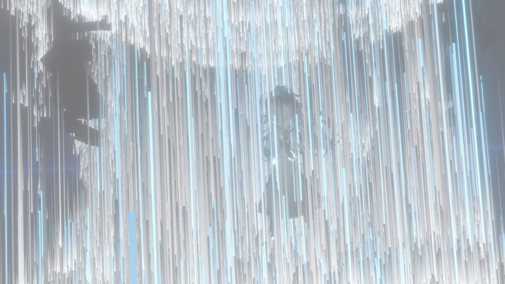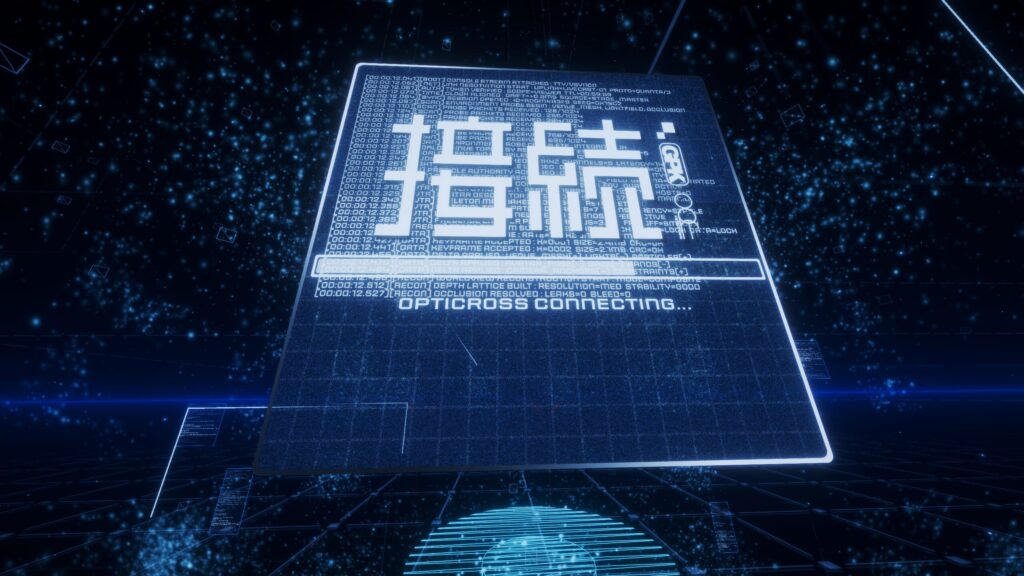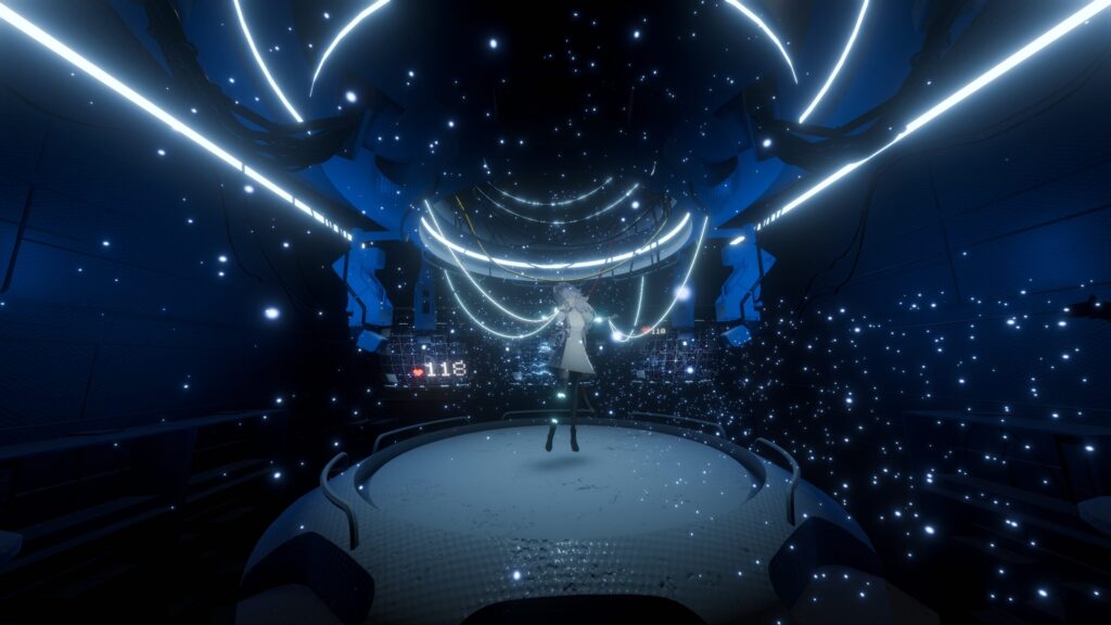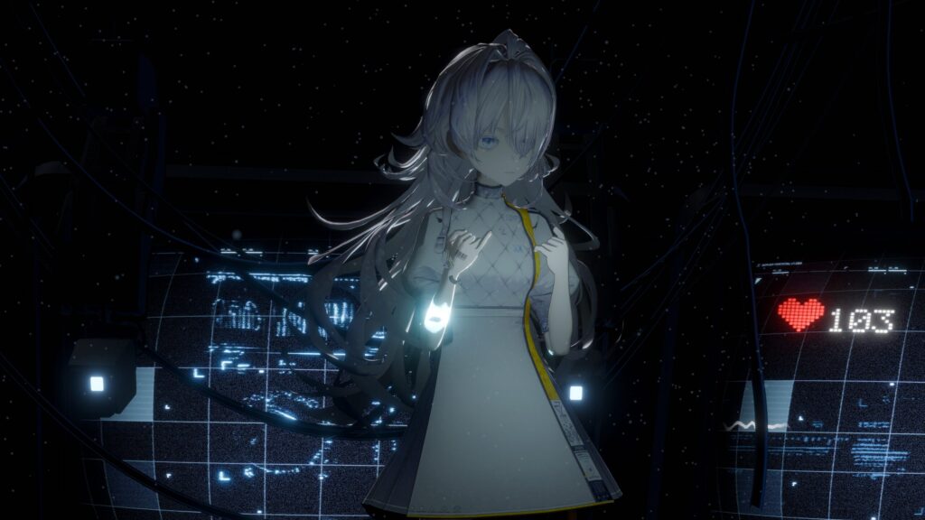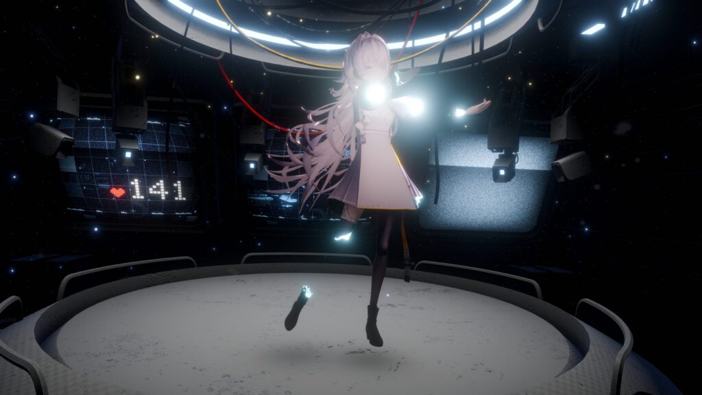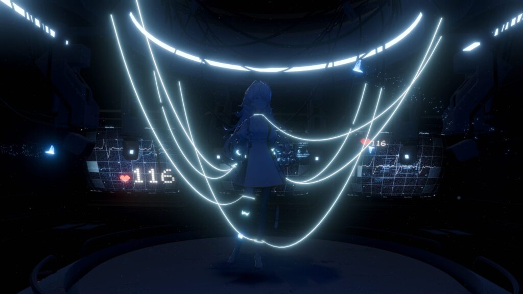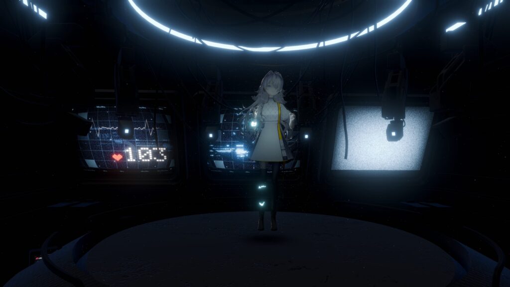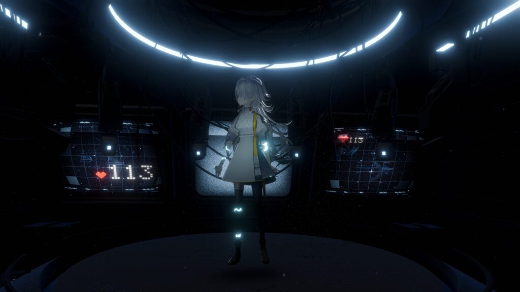 「接続」の文字とともに空間が書き換わり、実験室のような空間と月白 累が現れます。ポエトリーリーディングとして『失われた子どもたち』の物語が紡がれます。この時の、実験室後方のモニターには月白 累の心拍数が表示されており、月白 累の身体の一部の変化を示唆しているようでした。