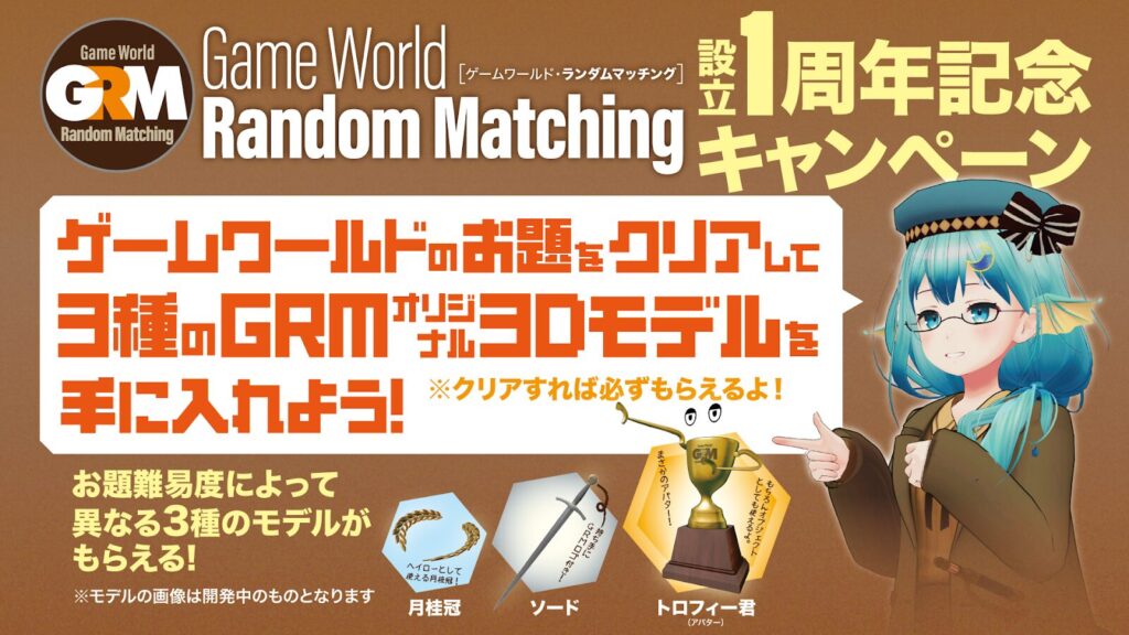 Gameworld Random Matching(略称:GRM)はジャンルを問わずゲームワールドを遊びたい人向けのグループです。 この度はGRM設立1周年を記念してキャンペーン企画を4/11まで開催します。