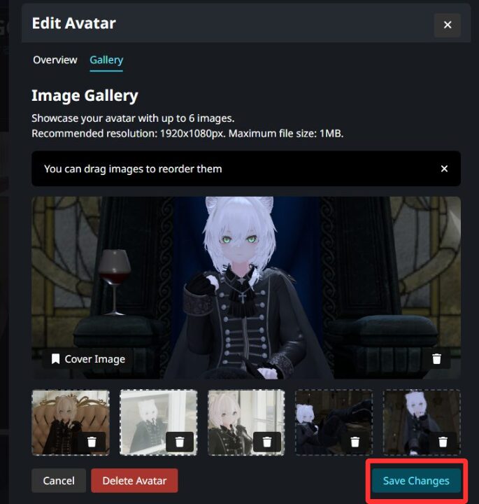 今回紹介している機能ではアバターのサムネイル画像1枚を変更するだけでなく、そのアバターを説明したり、アピールしたりする画像を最大6枚設定可能です。
