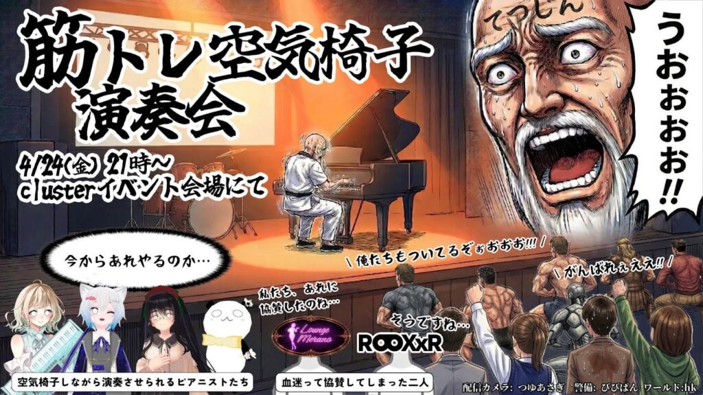 clusterで6年間・約140のエンタメ企画を手がけてきた主催てつじんが、「筋トレ空気椅子演奏会」を2026年4月24日(金)21時よりclusterにて開催します!