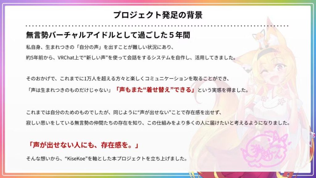 「無言勢なのに喋るバーチャルアイドル」として「KiseKoe」のプロトタイプのような自作のギミックを6年間使い続け来ましたが、多くの無言勢がコミュニティで孤立したり、コミュニケーションで困っているという声を聞いて、この仕組みを自分だけのものではなく、商品化して誰でも使えるようにしたいと考えました。