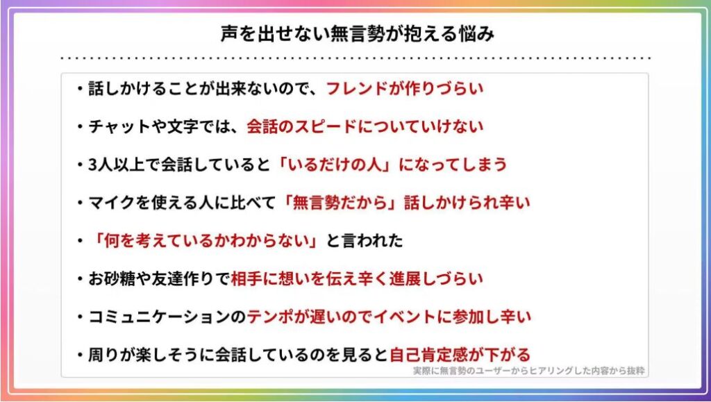 自分のアバターが持つ魅力を最大限に表現したいと願っていても、「声」という強烈なアイデンティティの一つが欠けることで、周囲との距離を感じる瞬間がどうしてもあります。