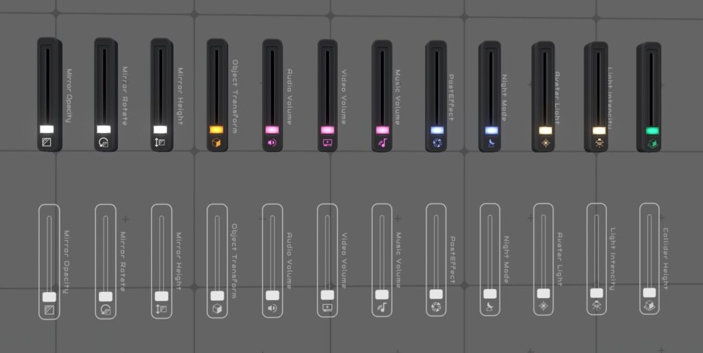 ライトの明るさを調整できるスライダーですが、ライトだけでなくVRCLightVolumes(VRCLV)のPointLightVolumeもコントロールできるようにアップデートしました。詳しくない人にはあまりピンと来ないかもですが、VRCLVのPointLightVolumeで照らす場合はリアルタイムライトのような負荷なく空間やアバターの明るさを調整することができるので、かなり便利です。是非試してみてください!