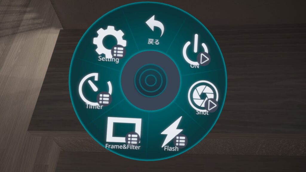 カメラギミックのエクスプレッションメニューは写真の様に、「ON」や「Shot」、フィルムの設定やフラッシュの強さなど細かに撮影方法を『VRChat』内で決めることができるようになっています。