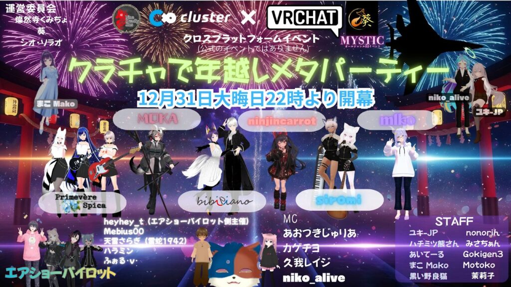 今回VRChatで開催しているDJイベント「MYSTIC」とclusterで開催している音楽系グループ「NineDeadlySins」との年越しコラボイベント「クラチャ年越しメタパーティー」の開催が先日決定されました。clusterとVRChatという別々のプラットフォームでの会場にて紅白形式でそれぞれの演者が演目を披露します!