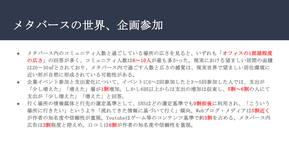 2024年8月に実施された“第2回”の『メタバース大規模調査』では有効回答数が407件と、たくさんの方々にご協力をいただきました。詳しい分析結果は以下のリンクをご覧ください。