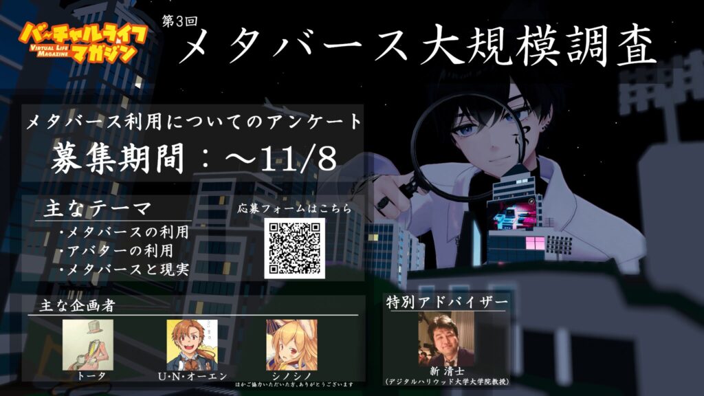 調査対象者はメタバースを利用する全てのユーザーです。このアンケート調査を通じ、メタバースユーザーの今を詳細に知り、さらなる界隈の発展・進化への礎になることを目指します。