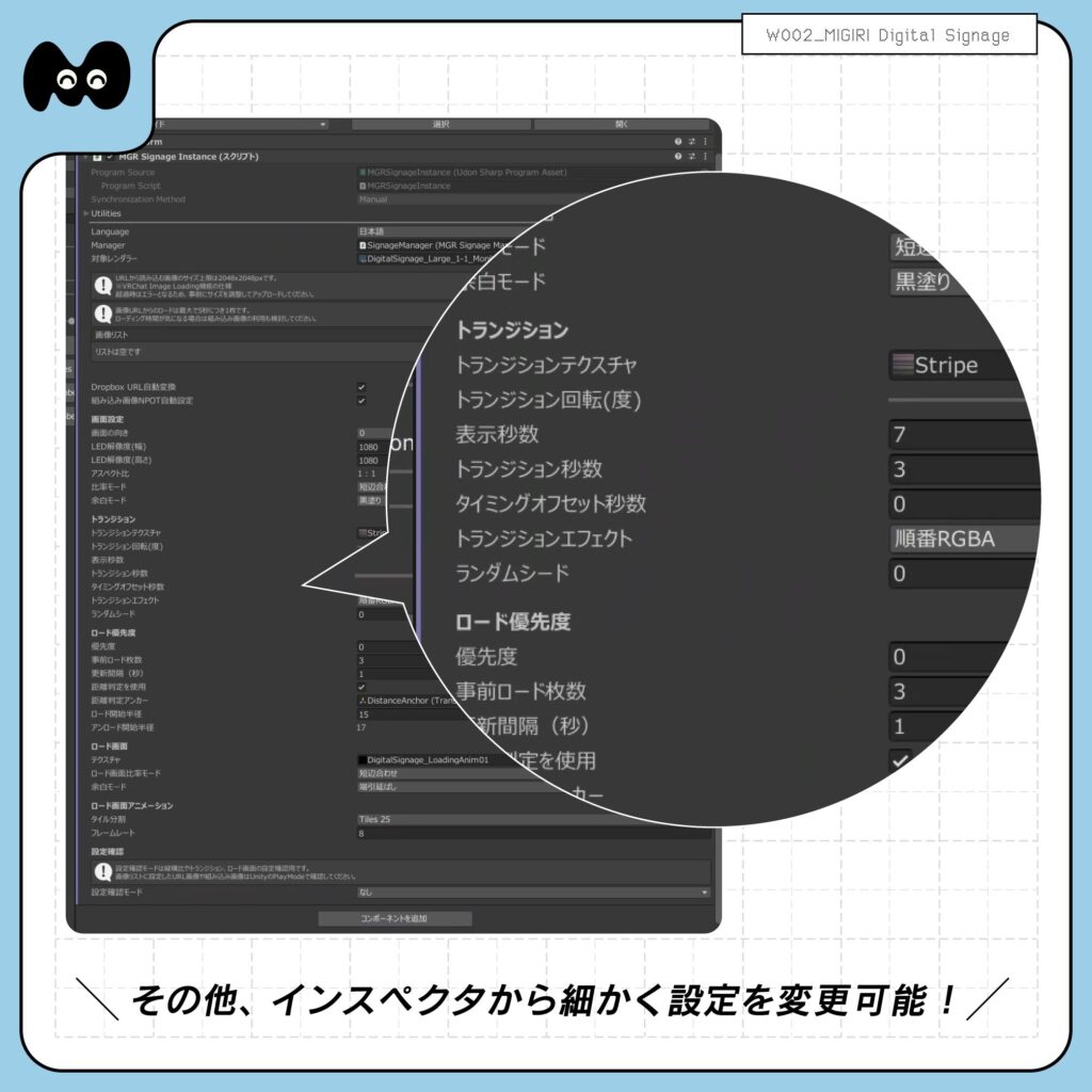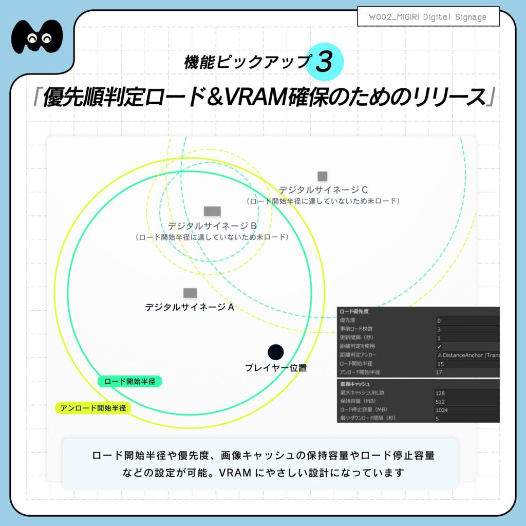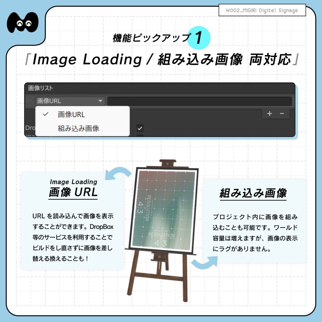 『MIGIRI Digital Signage』はImage Loadingと組み込み画像に対応したデジタルサイネージです。VRChatのワールド制作での使用を想定しています。
