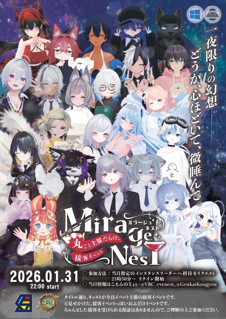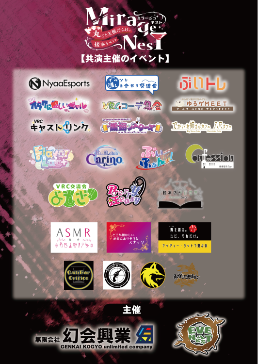 この度、2026年1月に「VRCイベント推しえ合おう交流会」が100回目、「無限会社 幻会興業」が4周年を迎えます。これを記念して、EVENesT×幻会興業のコラボ企画「MirageNesT〜ドキッ!丸ごと主催だらけの接客イベント〜』を1/31(土)22時より開催いたします。