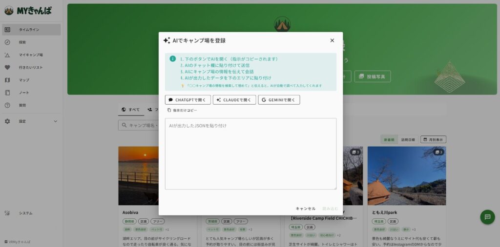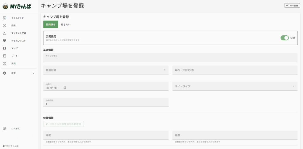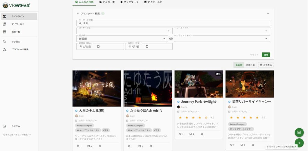 リアルのキャンプはもちろん、VRChatでのキャンプ体験まで記録できる、ちょっと新しいサービスです。