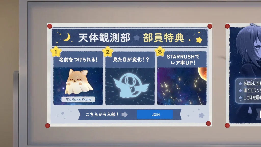 本ワールドはVRChatのクリエイターエコノミー(サブスクリプション機能)に対応しています。「天体観測部」に入部(課金)することで、お気に入りのアムアとさらに深い絆を結ぶことができます。