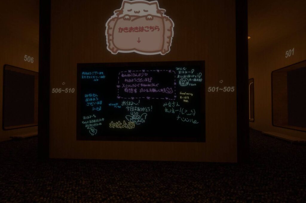 書置きボードがワールドにあり、書置きを部屋と書置きボードにキャストが残すのでワールドを出る前にぜひ見ていってください。