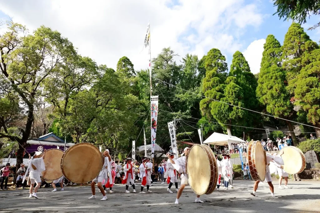 鹿児島県日置市の大田太鼓踊りは、城攻めの様子を全十五段階で表現する勇壮な踊りです。神明神社と徳重神社で毎年奉納され、太鼓と鉦の音に合わせて踊り手が舞う、進退のあざやかさに特徴があります。毎年10月第4日曜日の妙円寺詣りの期間に奉納されます。