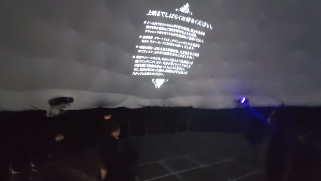 ドーム内の音響も本格的で、広場の南側・西側で常時鳴り続けていた屋外広告の音声が上演中は全く気にならないほどでした。上映作品の製作者の一人であるTakaomiさんのポスト(ツイート)によれば、水平に11台+斜め上に4台+真上に1台+LFE(ウーファー)2台=計18台のスピーカーが設置されており、上下・前後・左右のあらゆる方向から音が聞こえるように感じる「立体音響」の表現が可能な環境となっていました。