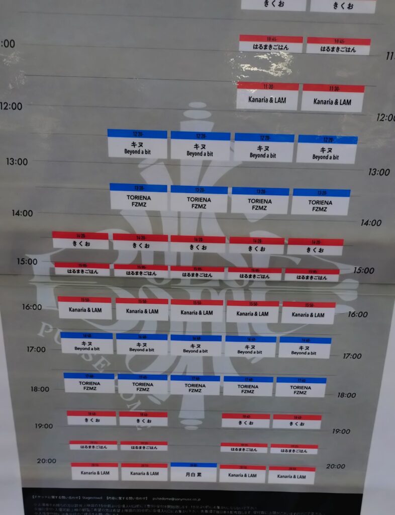 現地にあったタイムスケジュール。日付が見切れていますが筆者が行った1/8は公演2日目(左から2番目)になります