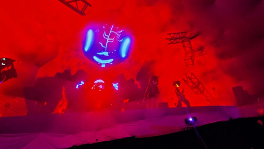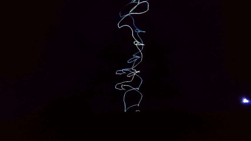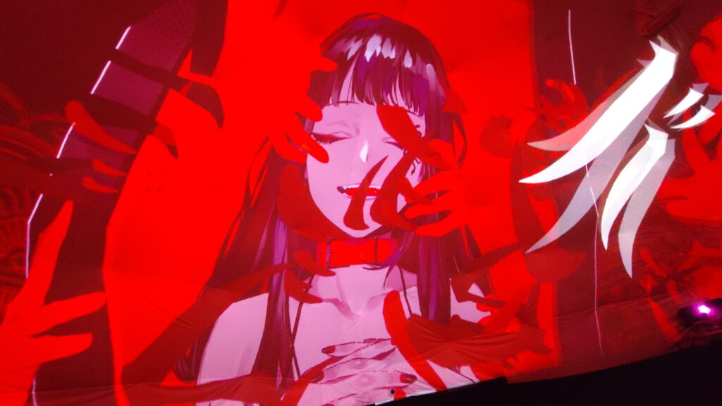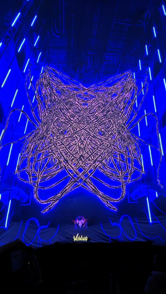 世界を股にかけるボーカロイドPである「きくお」氏がVRChat内で公開しているワールド「よるとうげ」を再構成した今回の上映。ポップさと混沌を併せ持つような音楽と映像が新宿歌舞伎町という大繁華街の真ん中で行われている事に感慨を覚えました。まるで現代芸術が街中に展示されているのを観た時のような。