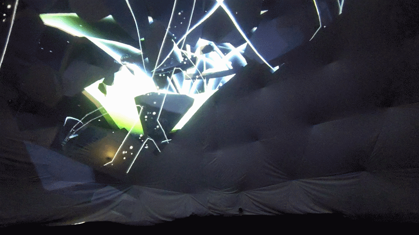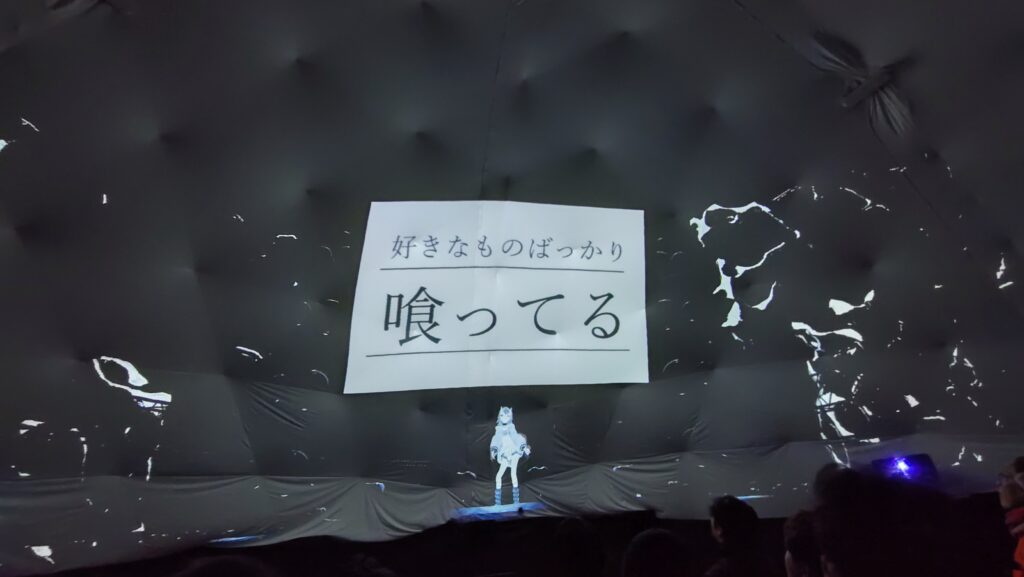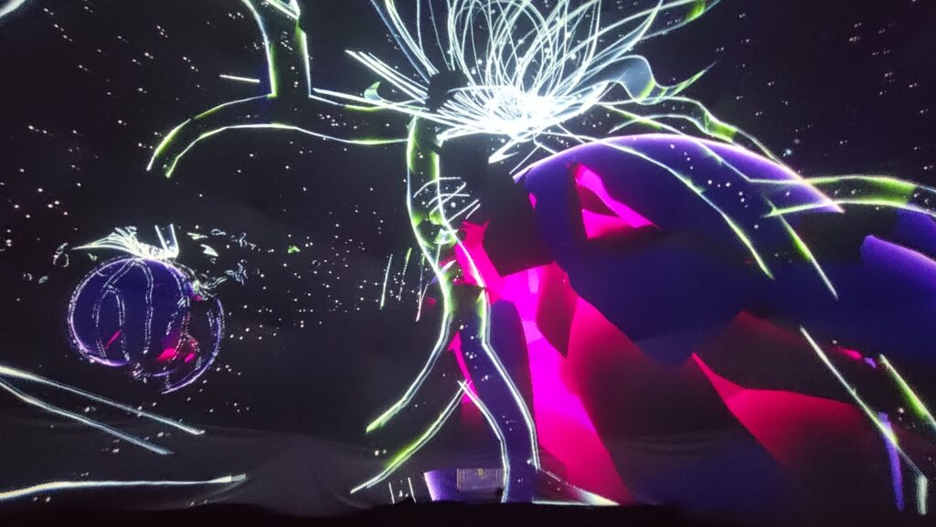 そういう状況下において、「半球型のドームを設置し、立体音響を可能とするような音響システムと一緒にドーム内で画像を上映する」という今回のイベントはVRの世界をHMD無しで疑似体験する方法として(仮設の施設で行うものとしては)非常に優れた形式だったように思います。
