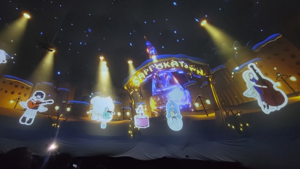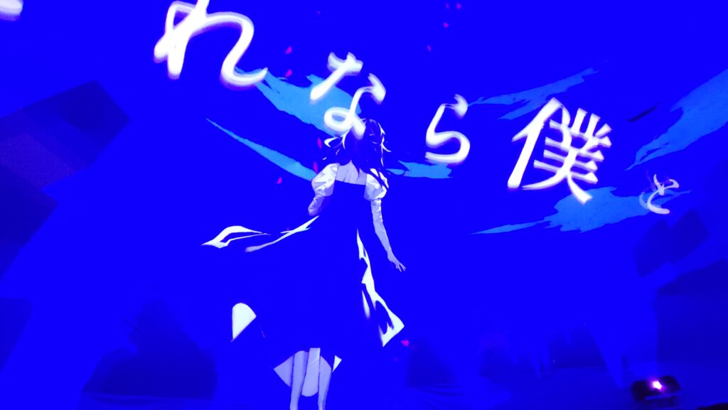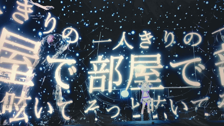MCではドーム内の様子に言及する一方、VRChat会場の様子(観客のアバター)に言及したり、「せっかくだから皆さんと目を合わせていきますね」といってVR会場の観客の方を見つめながら歩いたりと、VRと物理現実の両方がつながった世界でのライブ会場に居合わせたような感覚を覚えるようなライブでした。