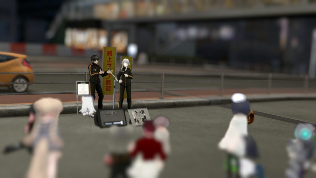 VRChatでは、パブリックインスタンスでの路上ライブ、専用ワールドでの月1開催の深夜の朗読・声劇イベントの開催をしています。