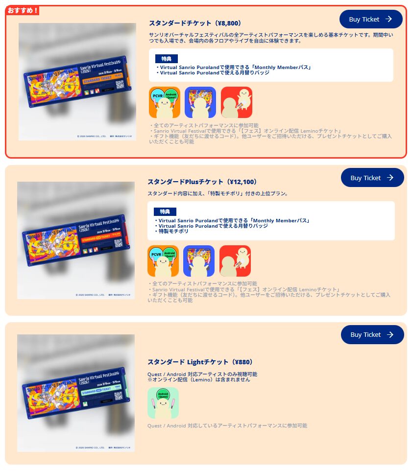 VRChatでサンリオVfesを満喫するためのチケットは3種類。PCユーザーの方は、迷ったらスタンダードチケットを購入すれば全コンテンツ楽しめるので間違いありません。