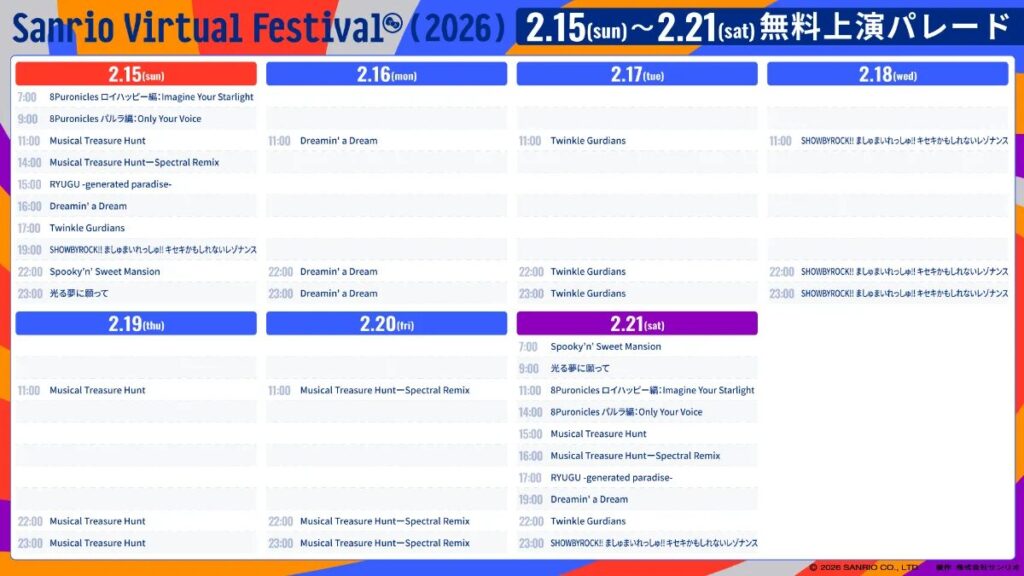 VTuber・バーチャルクリエイターなどによるアーティストパフォーマンスは『サンリオVfes』の目玉の一つ。週末の夜を中心に1日数組ずつパフォーマンスが披露されるほか、最後の週末である3月7日、8日には2日間で全アーティストのパフォーマンスを上演。また、3月15日、16日にはタイムシフトとして、日本時間の朝~昼過ぎにかけて全アーティスト再上演が行われます。