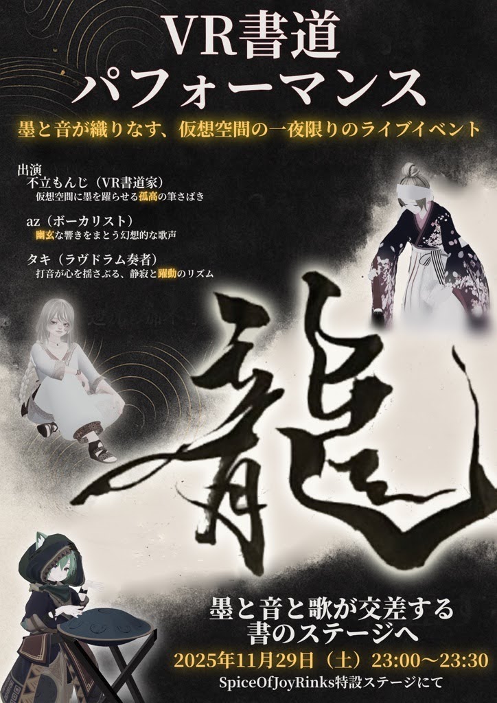 今までにソロ書道パフォーマンス「龍」、歌手や民族楽器演奏家とのコラボ書道パフォーマンス「響Hibiki」といった演目をSpatialやVRCというVRプラットフォームで披露してきました。