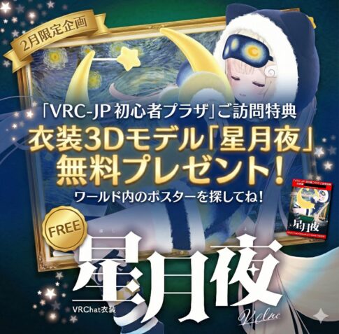 VRChat2月限定!全員プレゼント企画 「VRC-JP 初心者プラザ」ご訪問の方に 衣装3Dモデル『星月夜』を無料配布✨初心者さんも常連さんも、新規さんも大歓迎! ワールド内のどこかにあるポスターから Ὕ...