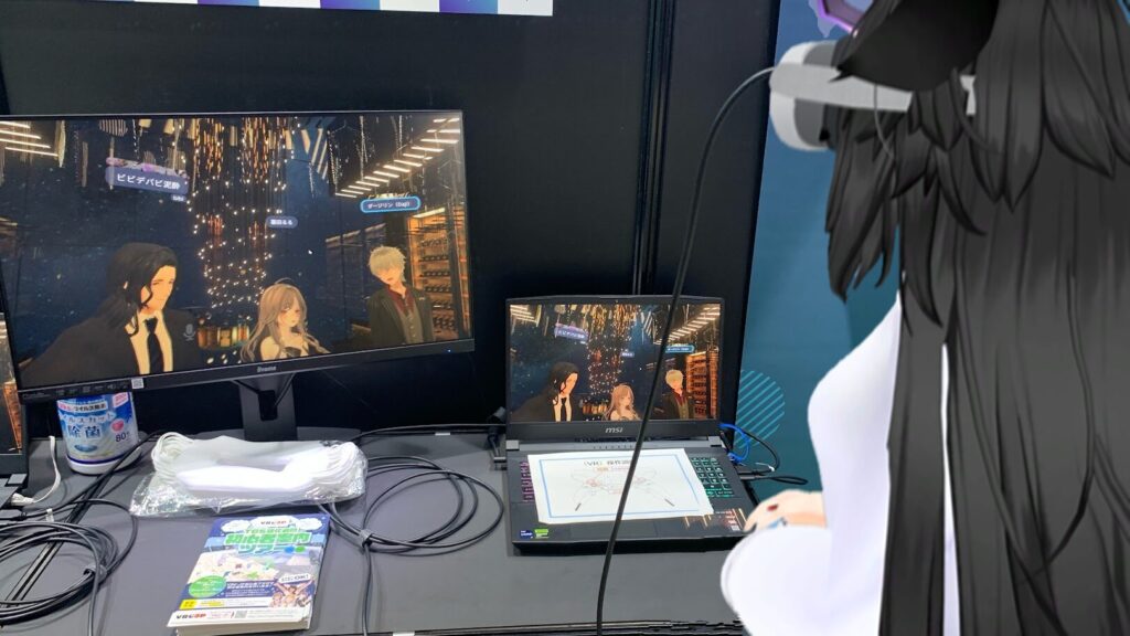 こちらでは、VRChatをVRとデスクトップで体験できるブースとなっており、今回はVRを被って体験させていただきました!