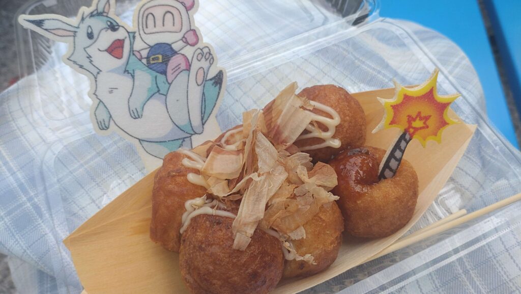 今回は、大人気ゲーム『ボンバーマン』をモチーフに制作された『ボンバーマンたこ焼き』。ウエハースに印刷された食べるのが惜しいほど可愛いボンバーマンと中がふわふわでとっても美味しいたこ焼きになっています。他も大人気で、どこも行列ができるほど。来年もあったら是非食べてみたい一品でした。